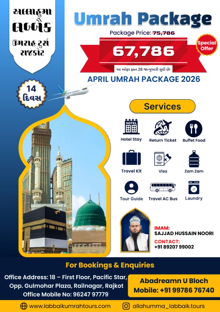 Allahumma Labbaik Umrah Tours, Rajkot is a dedicated travel and pilgrimage service established with the sincere intention of serving the guests of Allah. Our focus is to provide honest, well-organized, and comfortable arrangements for Hajj, Umrah, and Ziyarat, along with complete travel support services.